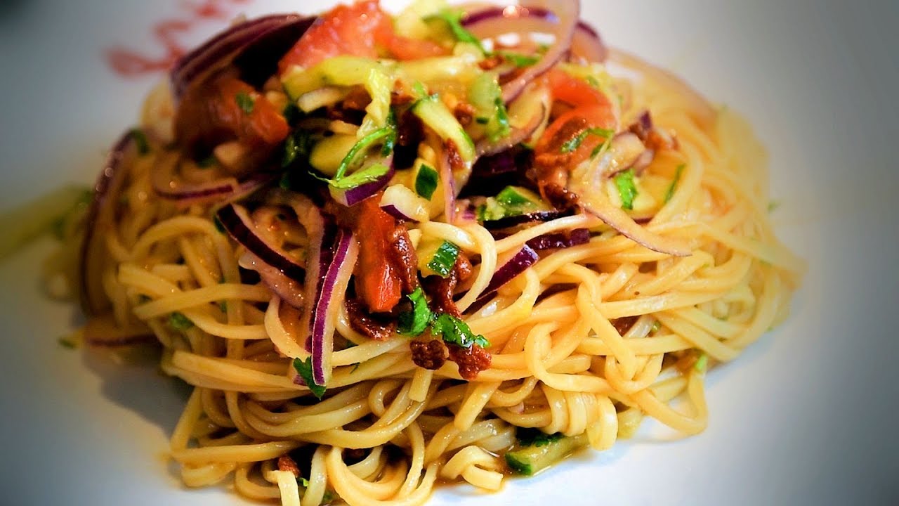 By now your noodles should be ready. Cooking them this way rather than boiling in a pan stops them from going mushy.